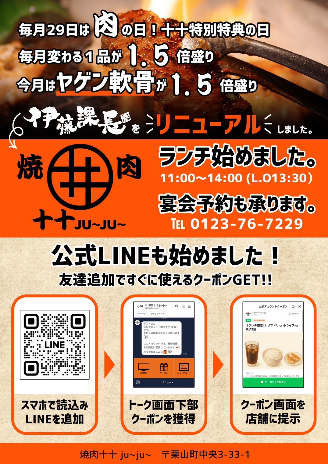 この度焼肉十十JU~JU~では、公式LINEを開設しました。